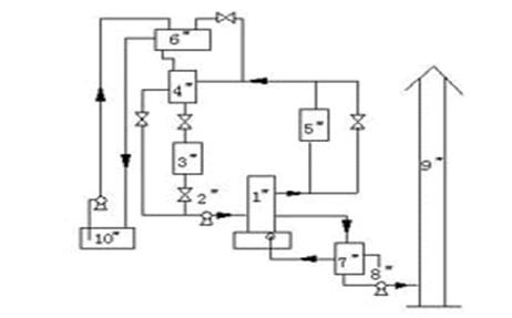 1 導(dǎo)熱油爐 2 熱油泵 3 過濾器 4 汽液分離器 5 加熱用設(shè)備 6 膨脹槽 7 換熱器 8 引風(fēng)機(jī) 9 煙囪 10 導(dǎo)熱油儲(chǔ)槽